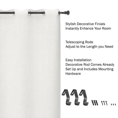 - PRODUCT DETAILS- Material: Steel, Dimensions: Rod Measurement: Extends 48-84-in, 1-in Diameter, Finial Measurement: (L) 2.75-in x (W) 2.5-in, Includes: (3) 4-in Wall Mounting Brackets, Screws and Anchors, Color: Antique Black Finish