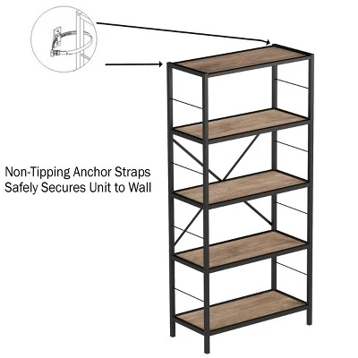 - QUALITY MATERIALS – Made in Vietnam of rustic-looking manufactured wood and a steel frame, this sturdy unit can be loaded with books or decorative pieces. Anti-tipping hardware is included to prevent the bookshelf from tipping over and for your safety.