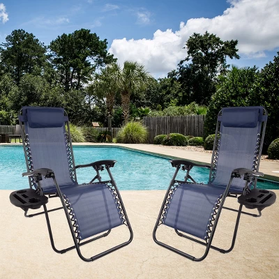 - PRODUCT DETAILS – Materials: Powder-Coated Steel and Textile Fabric. Dimensions: Open: (L) 63.5″ x (W) 25″ x (H) 43″; Folded: (L) 25″ x (W) 5.5″ x (H) 37″. Set of 2 zero-gravity recliner chairs. Max capacity per chair: 300 lbs. Color: Navy Blue and Black.
